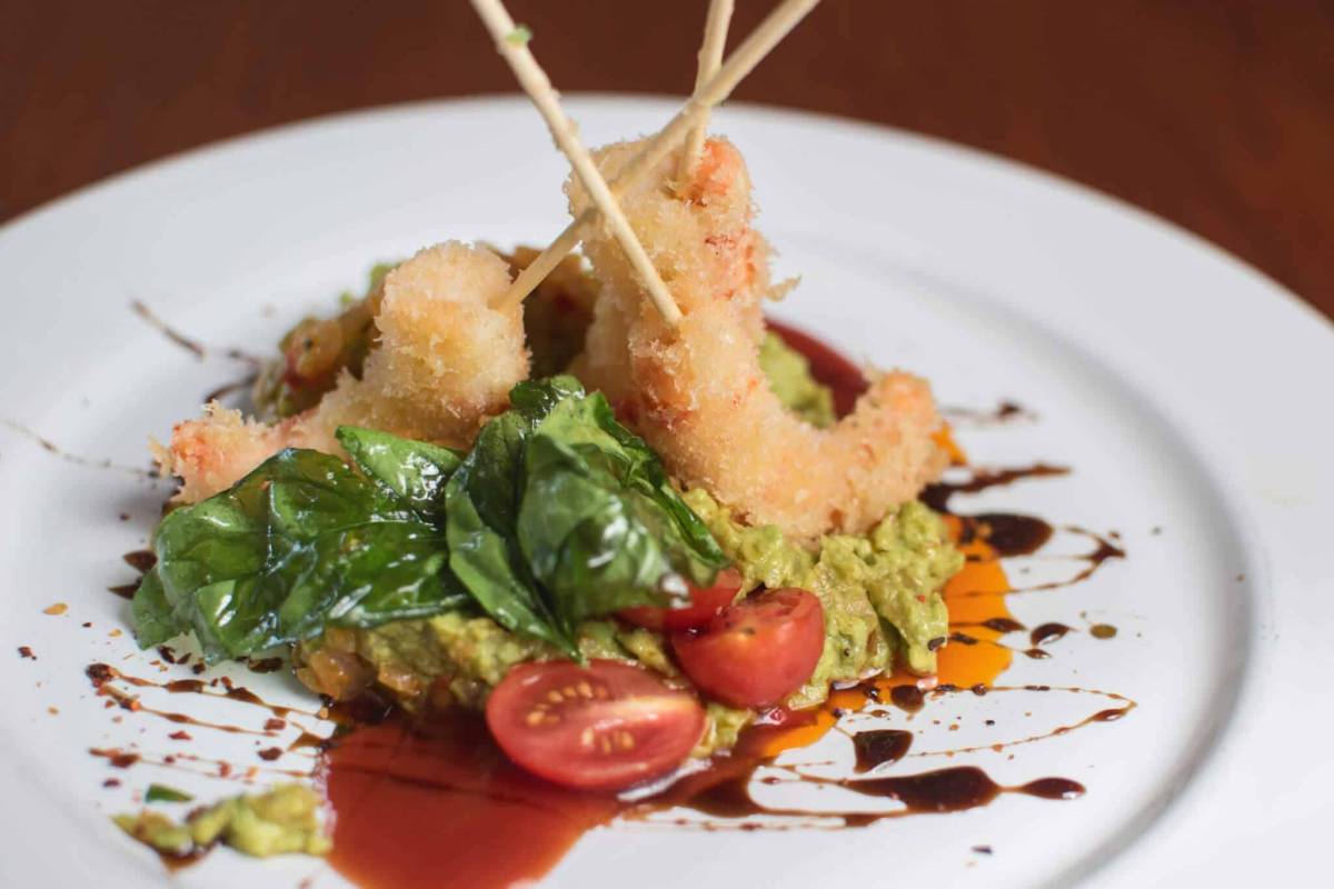 Preparación: Descarozar las paltas y pisarlas, mezclar con la cebolla y el tomate e incorporar jugo de limón, sal y salsa picante a gusto. Poner en la heladera en un bowl con papel film. Pasar los langostinos por huevo y luego por panko o pan rallado. Freírlos en abundante aceite por un minuto, seguidamente montar en un plato sobre el guacamole, decorar con aceto el cherry y la albahaca fresca o levemente frita.