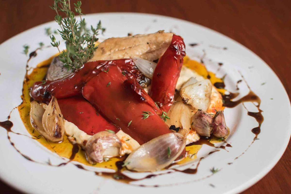 Preparación: Procesar los garbanzos con el jugo de limón, el aceite de oliva, el sésamo y un diente de ajo crudo hasta lograr un puré ligeramente espeso. Agregar sal, pimienta y comino (poco) y reservar. Limpiar los morrones, cortarlos en 4 a lo largo, sacar las nervaduras y las semillas, cortar las cebollas a la mitad. Cocinar todo en la plancha a fuego vivo, girando los vegetales con la ayuda de una espátula. La idea es que queden crujientes y tostados, con sal, aceite de oliva y ajií molido a gusto. Luego, cocinar las pechugas a fuego mediano, rociarlas con aceite de oliva y con un poco de tomillo y salpimentar. Montar sobre el puré de garbanzos o hummus. Decorar con una ramita de tomillo.