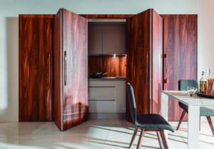 Si la cocina está integrada a otro ambiente del hogar, y la querés esconder, lo más nuevo son las puertas plegadizas y ocultables, que con un simple movimiento te permiten hacer desaparecer la cocina detrás de las puertas. Para esto, el sistema Finetta de Häfele es el indicado para ocultar la cocina, el lavadero o un bar en cualquier ambiente de tu casa.